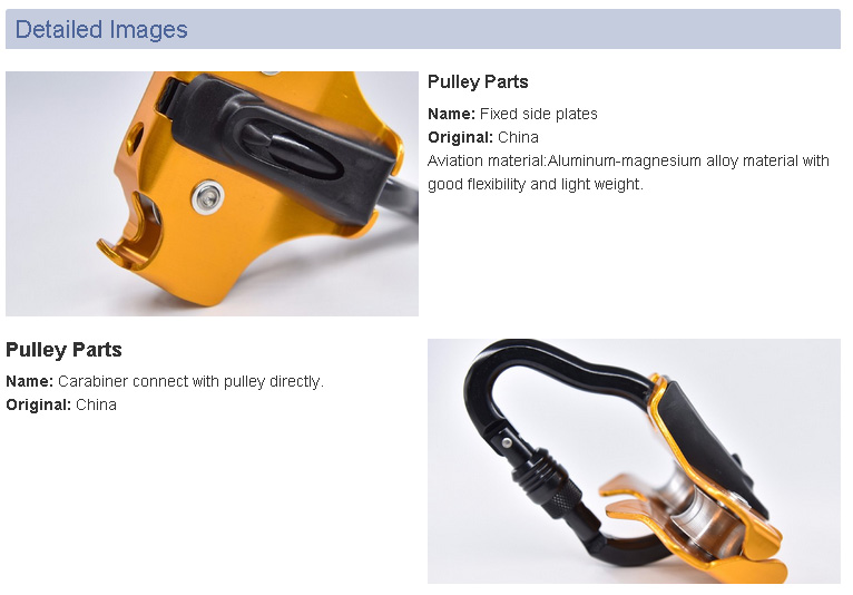 3) The attachment point at lower part can be linked with three carabiners at the same time,so as to arrange hauling in various directions or establish auxiliary belay systems.