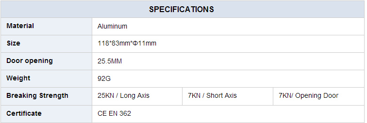 1) Large opening and wide axial surface allow easy connection to rope and other slings.