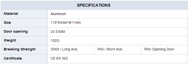 1) Large opening and wide axial surface allow easy connection to rope and other slings.